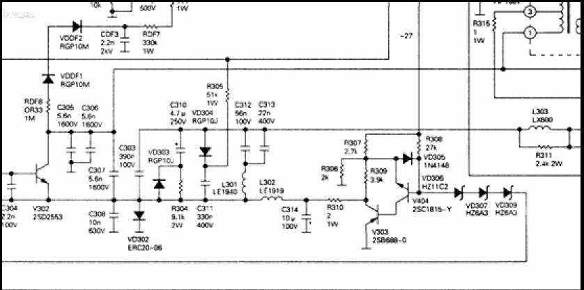 检查原来的修理工换过的电容,测量发现电容容量仅仅1N6 ,分别测量两只电容,原来的C305/5N6失容,并联的那只2N2的电容容量也下降于是更换一支6N2 的电容,试机,行场幅度均恢复正常。相关电路见下图: