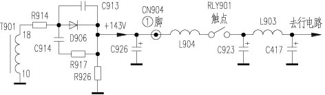 拔掉开关电源部分至主板的*头CN904,将100W灯泡改接在+B第一级滤波电容C926(10μF/160V)处,用两块万用表监测+B电压及+18V辅助电源电压,发现+B电压降到+6V左右,而辅助电源电压(空载)为+23V保持不变,这说明故障在+B处的整流滤波及其相关电路。查R914、C914、D906无异常,怀疑C926损坏。取下用MF47型万用表R×100挡测量无充放电现象,用数字万用表测量已无容量。C926图标为22μF/160V,而实物为10μF/160V,用正品22μF/250V电容代换后+B电压为+143V且稳定。接上原负载,在+B输出处串入电流表测其负载电流为400~550mA,在L904处串入电流表测行负载电流为300~500mA,在行管V402 c极串入电流表测其电流为850~1080mA,且电流随屏幕亮度增大而有所增大。上述测量值乍看起来好像误差太大而不正常,其实这是测量部位不同引起的误差,行输出电路本身没问题。更换C926后长时间观察,未出现任何异常情况。