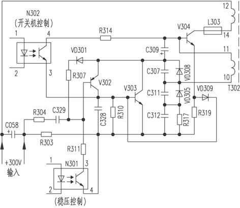 为什么会出现“吱吱”声?是什么原因导致屡损行管?分析后认为:在开关管V304由饱和进入截止期时,开关变压器T302 {10}、{11}脚(见附图)感应的电压是{10}脚正、{11}脚负,此电压经VD308整流后对C309充电,若C309容量减小或变质,就会使C309充电时间缩短,即V304截止时间缩短,导通时间延长,致使输出电压升高。另一方面,当输出电压升高时,注入光耦器N301中发光二极管电流增大,光敏管内阻下降,V302 b极电压降低而导通,V303 b极电压上升,V303 c、e极间电阻值变小,开关管V304 b极电位下降,而导通时间缩短,电源输出电压下降。显然,开关管处于异常状态,致使开关管工作频率下降,从而使开关电源出现“吱吱”声。
