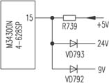 根据故障现象判断电视机已进入保护状态。该机采用三洋A3机芯,CPU为M34300N4-628SP,其{15}脚为过流保护检测端(见附图),正常时该脚电压应为4.5V,二极管VD792、VD793因为9V、24V的作用,反偏截止;若9V或24V支路过流电压大幅度下降时,VD792或VD793导通,{15}脚变为低电平,CPU{17}脚即变为5V高电平,使开关电源停振。