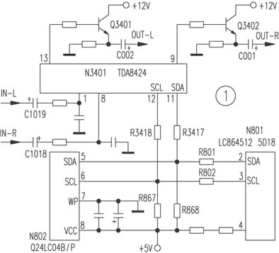 根据故障现象分析,初步判断该机因存储器工作失常,微处理器N801(LC8645125D18)发出静噪指令,导致无图无声。如图1所示,先查N801{2}、{3}脚电压为4.9V,再测存储器N802(Q24LC4B/P)各脚电压,发现{5}脚(SDA)电压仅2.6V,正常时应为4.8V,其余正常,故怀疑N802损坏,致使CPU与RAM间数据通信失常,产生本故障。但更换后故障依旧。经仔细检查,该机SCL、SDA信号线上还挂接有伴音处理IC N3401(TDA8424),TDA8424是I2C总线控制双声道伴音处理IC,它包括高低音处理、音量控制与均衡、单声/立体声转换等。CPU的SDA信号经R801、R3417与N3401{11}脚相连,断开R3417一端,测N802{5}脚电压已恢复正常,重新搜索,存储正常但无伴音。试将R3400、R3401与N3401的伴音L、R声道输入端{1}、{3}脚断开,直接与耦合电容C001、C002相连,开机出现不正常受控的伴音。由于此时伴音未经N3401处理,当将音量字符指示调出一格时,扬声器音量即为最大,否则为无声,证实N3401损坏。更换之,故障排除。