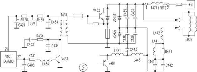 由于需要测试的项目较多,通电测试了约5分钟,开关变压器发出“吱吱”声,示波器上显示的测试波形消失,急忙关机,摸V432、L433烫手,查行管V432已击穿。鉴于该机属雷击损坏,怀疑仍有隐蔽损坏件未查出,故慎重地对有关电路进行复查,但未发现损坏元件。如图2所示,困境中断开行枕校电感L481,通电摸L433仍然烫手,噫,该不是未*上偏转线圈的缘故吧,找一代用行偏转线圈接入电路,试机V432温升正常,L433不发热,测试完毕将电路板装入用户机器中,图声俱佳,整机恢复正常。