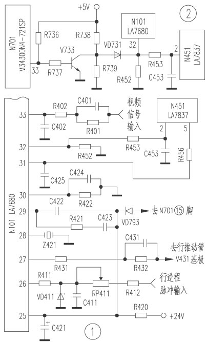 该机的场扫描振荡电路由LA7680{28}脚内部电路及外接的500kHz晶振Z421来担任。将500kHz的振荡信号经32倍分频器分频后得到行频脉冲,再分频后得到场频脉冲。用示波器测Z421两端振荡频率波形无异常,用优质同型号晶振试换Z421,故障依旧。为准确区分故障部位,从另一台同型机LA7680{32}脚取出场激励脉冲信号,加至该机LA7837{2}脚并脱开R453上端(见图1),试机图像同步良好,证实故障确实在场扫描同步电路。查LA7680{25}~{33}脚间的外接电路元件无异常,试换LA7680无效。对照电原理图分析,LA7680{26}脚和{32}脚都具有双重以上的功能。其中{32}脚可作为场激励脉冲信号输出端、场同步分离灵敏度设置端、外场触发输入端、自动触发方式解除开关以及场同步端,测LA7680{32}脚电压为1.7V左右(图标为4.8V)而C453、LA7680等已代换过。仔细分析电原理图,发现LA7680{32}脚还与N701(M34300N4-721SP){33}脚有关,于是再查R736~R739及V733、VD731(见图2)查出VD731反向漏电。更换VD731(1S1555)后复原电路试机,故障排除。