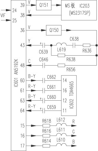 该机为多制式彩电,其中PAL信号流程如附图所示。中频信号由IC601{24}、{25}脚进入,经内部放大检波后的视频信号由{39}脚输出,经Q151缓冲后送至MS板,在MS板上经以IC203(M52317SP)为核心的制式选择电路选出所需的视频信号后送回至IC601{38}脚,由其{36}脚输出,经Q150缓冲后,其中亮度信号送回IC601{43}脚,色度信号由{48}脚进入。经IC601解调后的R-Y、B-Y色差信号分别由{61}、{60}脚输出,并分别进入IC602(TDA4665){16}、{14}脚,经过一行延迟后再由IC602{11}、{12}脚分别送回至IC601{64}、{63}脚。在IC601内部最后形成的R、G、B基色信号由其{15}、{16}、{17}脚分别输出,然后经视放板再加至显像管阴极。