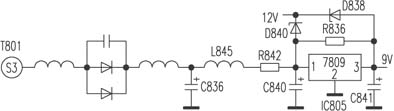 初步判断故障为ABL电路起控或亮度信号丢失造成。查得R板(画中画板)上Q1867、Q1866均呈导通状态,故ABL电路未起控;由于主、子画面均暗,亮度丢失点应在公共亮度通道上。本机属M18M机芯,设有许多画质改善电路,故在检修时可用信号短路法对相关功能板进行判断。拔下Y板(梳状滤波器板),用0.1μF电容短接主板上的A42插座{2}脚和A43插座{1}脚,开机主画面黑屏,子画面仍有暗淡图像;插回Y板,拔下M板(动态锐度校正板),仍用0.1μF电容短接主板上的A13插座{8}脚和A15插座{7}脚,开机故障现象未改变。由此确定故障点在位于Y板和M板信号流程之后的主板上,重点检查IC601(TA1215AN)及附属电路。经测量与亮度信号处理有关的管脚电压值均偏低较多,分析是由于其供电电压不足而造成。测其两组供电,其中12V正常,而9V电压仅为6.4V。顺线路走线查至D板,9V电压形成电路如附图。开关电源变压器次级S3脚输出的脉冲电压经整流滤波后为14V,再经L845滤波,R842限流后接IC805(AN7809){1}脚,测IC805{1}脚电压仅为7.2V,再测C836两端电压为14V正常。关机拆下R842测其电阻值为28Ω,而图标值为2.7Ω(3W),致使IC805输出电压下降,IC601内亮度通道增益下降,而造成光暗;又因9V供电不足而影响了IC内有关场电路,出现场幅压缩现象。将R842更换后,图像恢复正常。