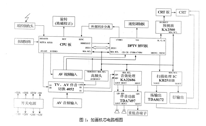 AT2970i、AT2935i、AT2927i、HiD34286P、HiD29286P、AT2970P等。该系列机型采用Trident公司DPTV方案,可实现75Hz/隔行或60Hz/逐行显示(型号后为P机型)。该机芯所有机型具有相同的电路结构,功能方框图如下面图1所示。