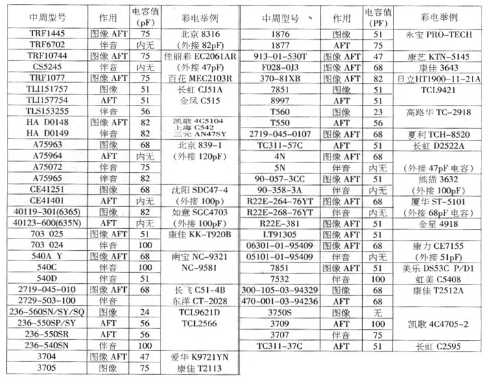因瓷管电容变黑而产生的故障较常见,而维修难点往往是不知其准确电容值。笔者通过试验:先准备好多只小容量瓷片电容(20pF、27pF、36pF、39pF、47pF、51pF、68pF、75pF、82pF、100pF),选择合适瓷片电容直接代换,或采用串、并联改变电容容量大小的方法来试验,可使此故障得到根治。附表是我维修中试验记录下的数据,供参考。