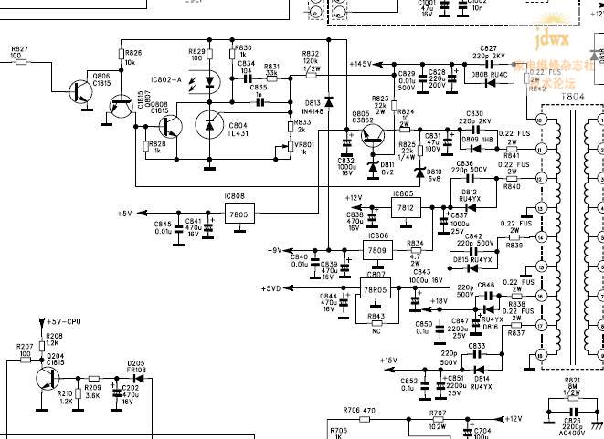 现在是+B电压才18伏,其他各组电压就更低了,所以每组的三端稳压根本就不能输出电压,那cpu的5伏就无法建立。强制开机电压130伏,其他各组电压都能正常输出,证明各路三端稳压都是好的,并无短路等。那么为什么在+B18伏(也许是正常的待机电压)时,IC808没有产生5伏,因为当时没有查Q001,002,等。那么可能5伏的负载有问题?就是说现在的电源基本是好的 两天没有去了,准备这两天在上门看看有进展没。 多敏的帮助