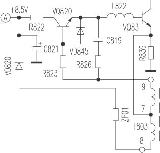 该机电源恒流驱动部分电路如附图所示。图中VQ820为驱动控制管,由T803{9}脚提供正反馈控制信号。VD820和C821为恒流驱动电源的整流滤波元件,R822为驱动电流限流电阻,其阻值大小决定驱动电流的大小,驱动电流越大,带负载能力越强。图中A点由VD820提供恒流驱动电压,它受待机控制电路控制。正常时,A点电压在待机时为3.5V左右,二次开机时为8.5V左右。实测A点电压在待机时为0.1V,开机时为0.4V左右,这说明恒流驱动电路没有正常工作。A点电压低可能有两方面的原因:(1)A点后面的负载电路有短路故障;(2)整流滤波电路有问题。检查负载电路没有短路现象,检查整流滤波电路的VD820、C821、ZP01也没有发现异常,难道是T803有问题?在开机状态下测T803{8}脚有5V左右的交流电压,那么为什么整流滤波后电压变低了呢?重新焊下VD820仔细检查,发现和正常二极管相比其正向电阻值偏大。更换VD820后,A点电压恢复正常,+B电压恢复正常,上述故障现象排除。分析认为,是VD820正向电阻值变大使恒流驱动电源的内阻变大,导致该整流电源带负载能力变差,从而使整机开关电源带负载能力变差。一个貌似复杂的综合性故障,其罪魁祸首竟是一只小小的二极管