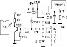 该机字符显示要正常,须具备以下条件:CPU(TMP47C1238ANU068)内设屏显电路,包括其{39}、{40}脚所连接的字符振荡器LA02(TRF1166D)工作正常,CPU{37}、{38}脚输入的行、场消隐信号正常,{32}、{33}、{34}、{35}脚等构成的屏显驱动输出电路工作正常。经检查,发现CPU{37}脚无行消隐信号输入,该信号的流程是:T46110脚→C444→R245→RA41→VQB01→CPU{37}脚,见下图。顺该信号流程检查,发现行输出变压器T46110脚的行脉冲信号很弱,怀疑其外接二极管VD405有漏电现象。焊下VD405测其正反向电阻值,发现正反向电阻值均在3kΩ左右且有变化。更换该二极管后,字符显示恢复正常,画面彩色亦正常。