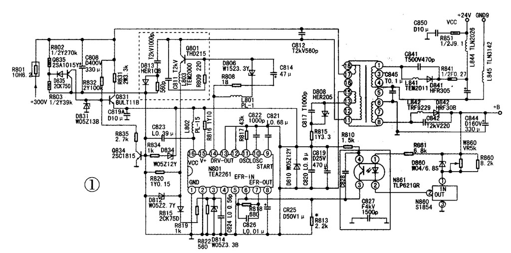 集成电路TEA2261是该机开关电源的核心部件,如图1所示。开关电源不启动,首当查之。故测量TEA2261各脚电位,均不正常,尤其16脚电源端,电压应为12V,实测8~9V;14脚为输出端,控制开关管Q801基极,电位仅0.1V。显然,TEA2261无信号输出,使开关管不能触发,以致开关电源不启动。
