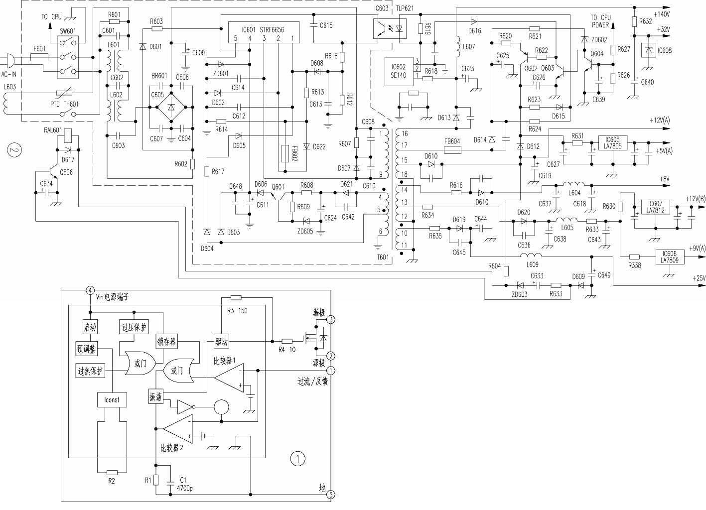 当IC601中的温度检测元件检测到基板温度超过140℃,或{4}脚电压超过22.5V时,内部锁定电路延时8μs后动作,振荡器停振,起到过热或过压保护作用。为了防止锁定电路受*扰而误动作,厚膜块内部设有定时器,只有当过热或电路动作持续8μs以上时,锁定电路才开始工作,使电源电路停止工作。异常情况消失后,重新开机可解除锁定状态。