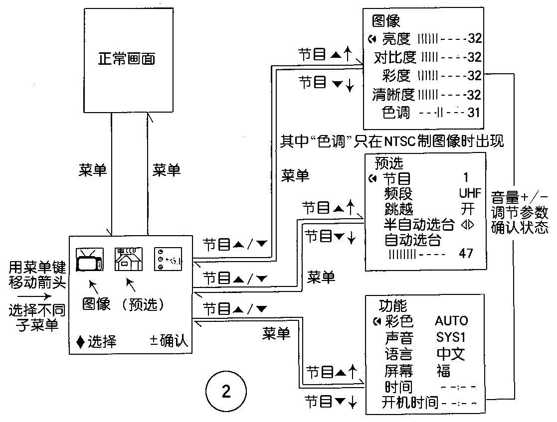 F2109A采用日本三洋公司LC863348A和LC863316A正好与TV处理器LA76810配合,F2109E2/G的微处理器TMP87CX83(康佳编号为:CKP1301S)与TB1238N均是东芝公司产品,其配合相当完善。LC863348A内设有64KB快闪ROM,有较大内存容量,因此能实施更多的屏显功能,缥扌藕攀背死镀辆苍胪猓箍上允竞谄劣牍龆疜ONKA字幕相配合,既保护屏幕又利于保护眼睛,并且采用动态图案菜单显示,更加直观有趣,如图2所示。而TMP87CX83其ROM仅有24KB,因此限制了过多的屏幕功能,但保留了无信号蓝屏静噪以及为了保护屏幕而采用黑屏和滚动KONKA字幕的形式。F2109C采用Zilog公司的Z90231微处理器康佳编号为CKP1105S/S1,内设有24KB EPROM存储器,显然内存相对较少,所以其屏幕表象功能与F2109E2/G相当,无动态图案菜单显示,今列表展示其差异(参见表3)。