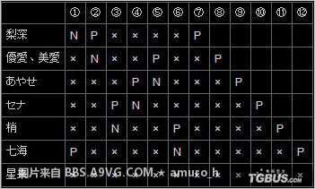 ★角色路线突入 这次的混沌头,完全取消了对话选项,所有分支都通过妄想来决定,整个大流程一共12次妄想(所以说流程超短.....)通过妄想积累好感度,从而触发角色路线的开启 结合日站的路线表~可以总结出走2遍就可以达到8个角色的结局 P(按LT)是积极妄想,N(按RT)为消极妄想,X是不妄想.....