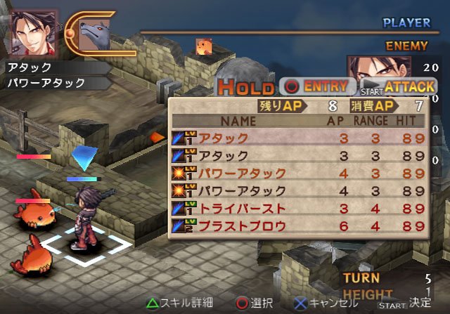 重点介绍一下 其实也就是攻击技能 技能主要分为火焰,冰,风,土,圣,暗,泛用,威力,特殊,无等各种属性,每种武器就有其对应的一些属性,如主角用枪就对应泛用和威力等,镰刀就对应冲击,威力等(当然也是有冰属性的枪或火属性的镰刀);各种技能也是有其等级的,最低1级,最高4级,越高级的特技需要越高的ap,想要攻击就得先有足够的ap,还有特别的属性就是怪物属性,这里只有捕获这个技能是怪物属性的,捕获就是抓怪物,以后再详细介绍,这里的技能选项就是使用单个的技能,只要射程和ap足够,有目标即可,特技里最底下的是个人攻击技能,需要角色ap底下的那个0升了才可以发动,比如主角的第一个个人技能需要0变成1才可以发动,发动之后1又变成0,要增加需要不停的攻击和被攻击,其实这个就是SP