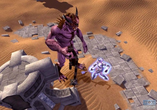 【游戏介绍】:SOE宣布将以人气MMORPG「无尽的任务」世界观为基础推出一款PS2的动作RPG游戏「Champions of Norrath:Realms of EverQuest」,本作由制作「柏德之门:黑暗联盟」的Snowblind Studios担纲制作,游戏中准备了单人与多人两部分,其中在多人模式部分采用目前预定发售的PC RTS大作「Lords of EverQuest」的网络配对支持系统,可让玩家最多4人同时上线组队游乐,另外游戏中还提供50个以上的迷宫关卡与上千种道具武装,玩家还可以自行合成魔法武器与盔甲等装备,同时游戏里玩家还可以自5名角色中选择其一来扮演,这5名角色分别包括野蛮人战士(Barbarian Warrior)、黑暗精灵暗骑士(Dark Elf Shadow Knight)、高等精灵牧师(High Elf Cleric)、博学者巫师(Erudite Wizard)与木精灵游侠(Wood Elf Ranger),玩家不但可以任意改变角色的发色与皮肤颜色、纹身等内容,每名角色种族也都拥有不同的能力特征,让玩家能在这款动作RPG中体验不输「EQ」的全新乐趣。