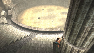 进去后跳上左边的平台,从水路来到一间有铁笼的房间,利用柱子和铁笼进入一间斗技场,跳上观众席,利用观众席上的柱子跳到一间有铁门的房间,拉下开关打开下面的铁门,进去把大铁笼上面的小铁笼拉到外面的房间的铁笼上得到一把钥匙,继续回到上面拉开关的房间用钥匙打开旁边的铁门,上到斗技场屋顶,利用两次绳索,来到一间屋顶有两座武士雕像的屋子进去后即可过关。