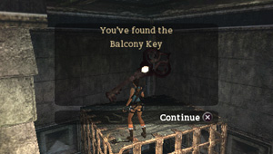 从右边第四根柱子开始,跳到最高的柱子上,在从旁边的阳台利用绳索跳到一间墙上有发光浮雕的房间里,从旁边另一座浮雕得到提示,回来踩上发光浮雕前面的机关,用枪打亮浮雕上的刀身和眼睛上的亮点,进入打开的通道,在对面阳台地上的浮雕得到提示,回来点亮浮雕的手,腰和两只脚,把身后铁球的两个铁环拉掉,把铁球推到房间中间的开关,从最高的柱子跳到打开的门里,拉下下面的开关打开门,把外面的铁球推进来压住地上的开关。