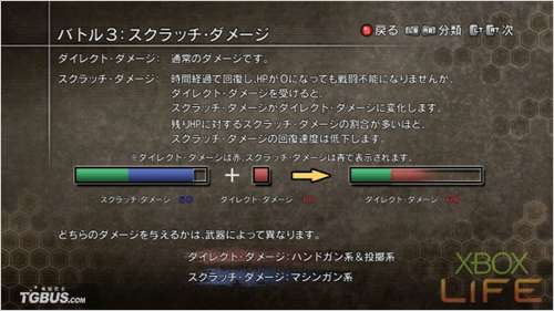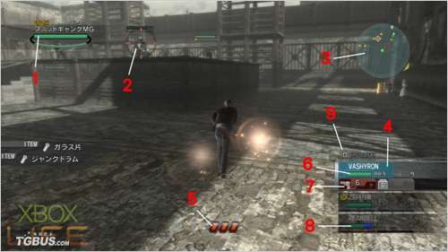 1. 敌人的HP与情报。 2. 瞄准的目标。 3. 战场小地图,绿色的点是我方位置,黄色的点是敌人的位置,可以按下左类比杆切换区块地图。 4. 行动力计量表(蓝绿色部分),只要玩家在地图上走动就会渐渐减少,归零以后就无法行动而切换为下一个角色。 5. I.S.计量表。 6. 角色的HP。 7. 手持的武器与道具。可以利用LT与RT键来切换,或是按下BACK键开启道具选单来装备使用。 8. 暗掉的格子代表此角色已经行动过了。 9. 共鸣点数。 手把基本操作: 左类比杆LS:移动角色。 右类比杆RS:移动摄影机角度。 十字键:切换目标。 LB、RB:切换操作角色。 A:集气攻击。 X:无敌动作(インビンシブル・アクションInvincible Action) Y:共鸣攻击(レゾナンス・アタックResonance Attack) BACK:开启道具栏 2. 武器与伤害类型 《永恒终焉》的战斗系统中,使用的枪械可以分成三大类,分别为手枪(handgun)、机关枪(machinegun)、榴弹(grenade),每一种武器都有各自的优缺点,每个角色所装备的武器系统可以从战斗时画面右下角的小图确认。 而攻击敌人时的伤害有两种,可以由敌人伤害的数字颜色来分辨,红色的为直接伤害(Direct Damage),蓝色的为间接伤害(Scratch Damage)。给敌人造成的伤害种类根据武器种类而不同,手枪系和榴弹都是属于直接伤害的部分,机关枪系则是蓝色的间接伤害。