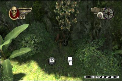海岛的风景还真是不错,前行不久发生剧情,注意发射毒箭的骷髅机关,被射中可是一击必杀的,在有很多机关的地方要先绕到右方,找到背朝路口的骷髅,(先不要进洞)到达一处藤下上去打开机关。
